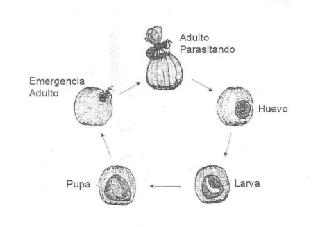 El ciclo biológico de Trichogramma está influenciado considerablemente por factores como la temperatura, la humedad relativa, el fotoperíodo y el huésped. La duración promedio desde la oviposición hasta la emergencia del adulto es de aproximadamente 3 días. Sin embargo, temperaturas inferiores a 25 °C prolongan la duración del ciclo (Figura 1).